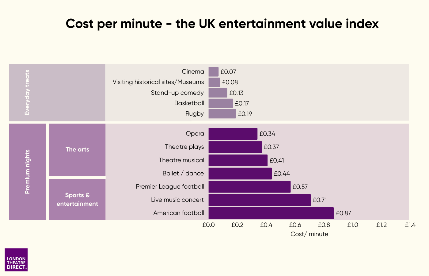 That’s where theatre stands out. Theatre categories are generally seen as more premium experiences, but when you measure cost-per-minute, they sit below several other big-ticket activities.
