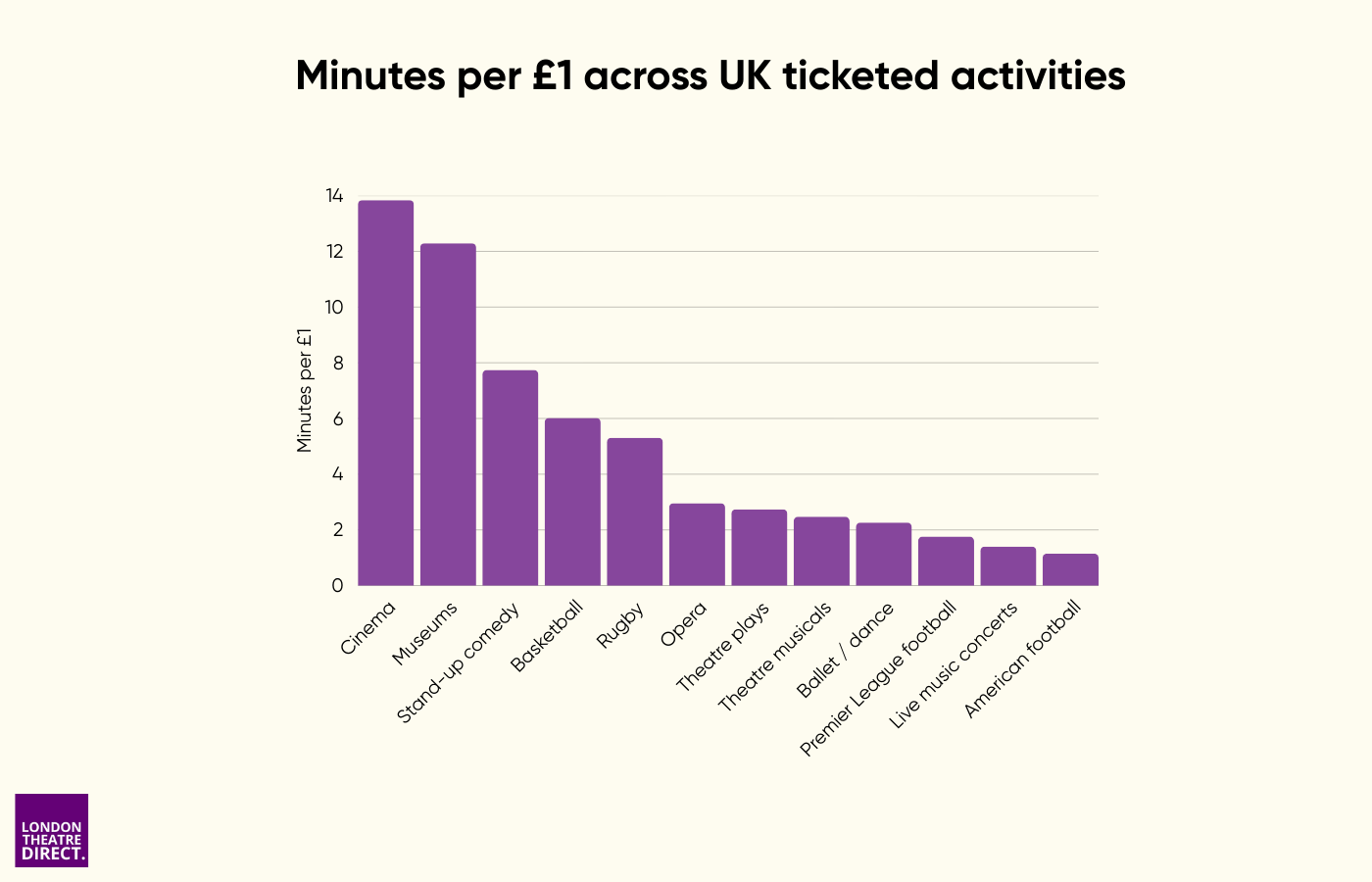 - Theatre plays: ~2.7 minutes per £1