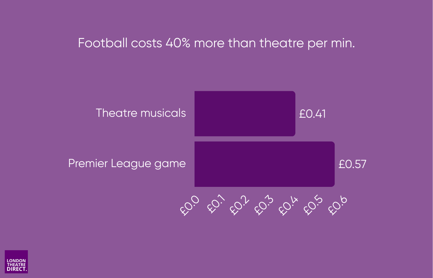 That means Premier League football is 40% more expensive per minute than theatre musicals, despite the slightly cheaper average ticket price. Put simply: you get more minutes for your money at the theatre than the ticket price alone suggests.