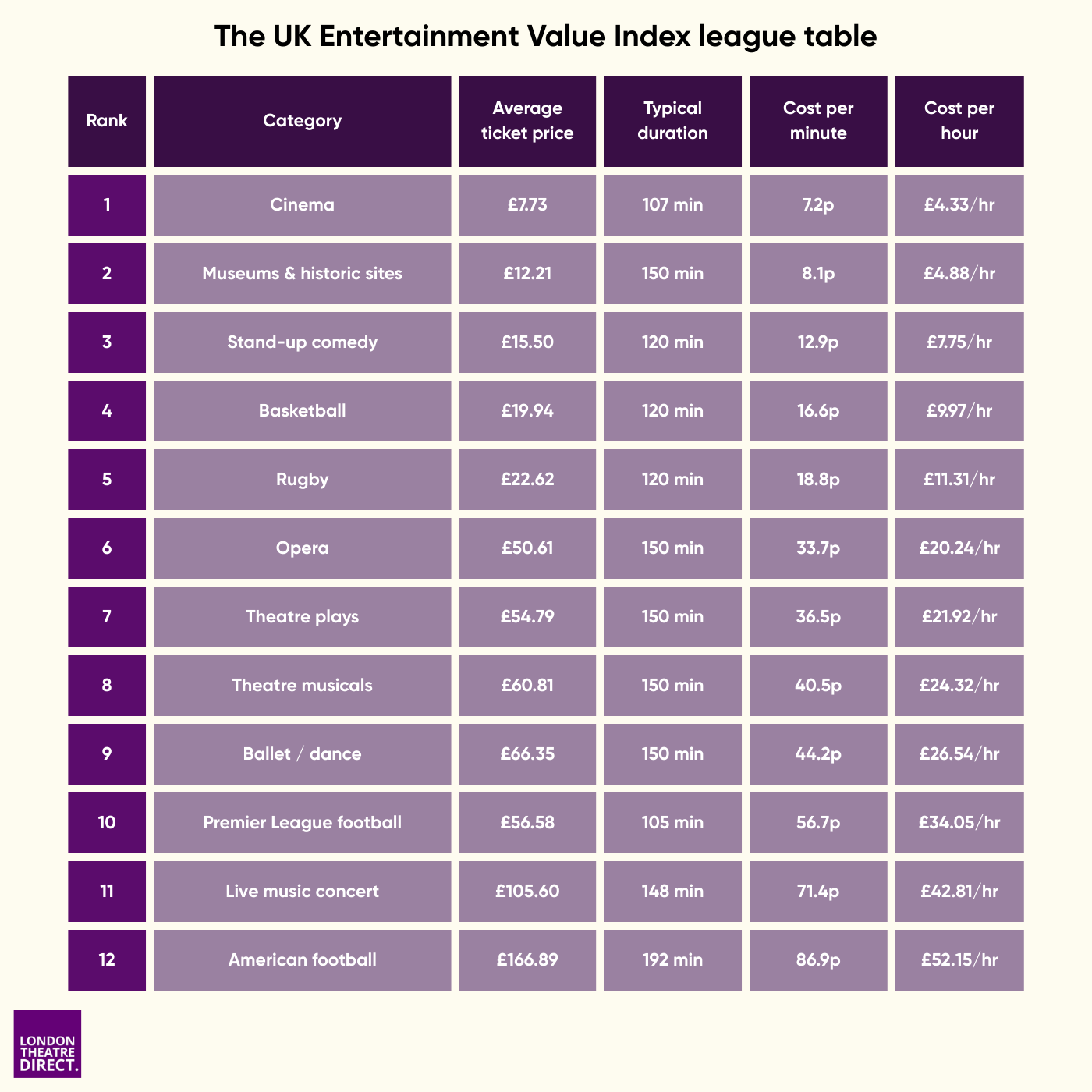 That’s why London Theatre Direct created the UK Entertainment Value Index, to see how 12 popular ticketed nights out stack up when you look at them through the same lens.